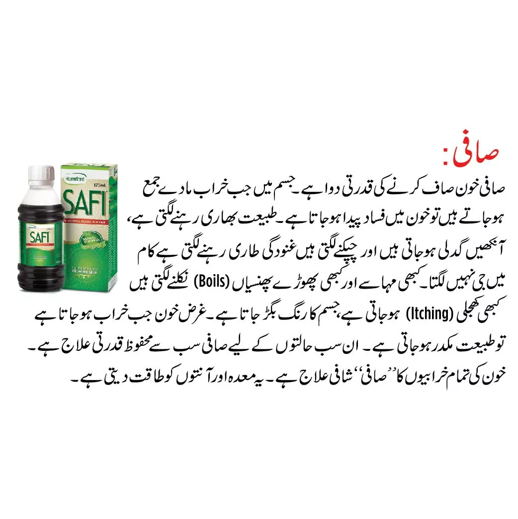 Safi is effective blood purifying herbal medicine which has replaced the old purgation therapy. It spurs system on to start elimination of the accumulated morbid matter the root cause of almost all allmenty thorugh the intestines kidneys and skin correcting their function .Safi correct the digestive system relieve pain constipation prevents and cures bolls, pimples and skin aruption.